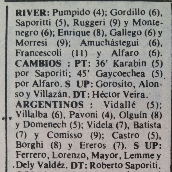 • De memoria, recuerdo 4 futbolistas en cancha que meses después serían campeones del mundo (Ruggeri y Enrique por River, Batista y Borghi por Argentinos).