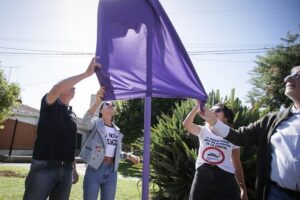 MAYRA. En la víspera del Día Nacional de la Memoria, Verdad y Justicia, la jefa comunal descubrió una señalética perteneciente a un detenido-desaparecido en el barrio La Colonia. En el marco del Programa Esquinas con Memoria.