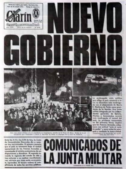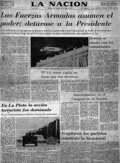 «Nuevo gobierno» titulaba Clarín, o “ las Fuerzas Armadas asumen el poder”, titulaba La Nación. Esas frases, que parecen neutras, ocultan un aval al golpe, pues quien no se opone al quiebre del orden constitucional, claramente lo avala. Clarín explica que “la prolongada crisis política comenzó a tomar su desenlace con el alejamiento de María E. Martinez de Perón de la presidencia,y una junta militar asumirá el control del país”. La Nación, además, aclara que “Fue rechazada una propuesta tendiente a evitar la ruptura institucional.