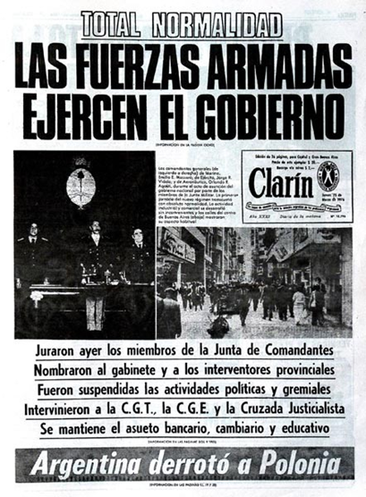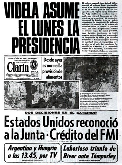 Los días posteriores, los medios reflejaban la tranquilidad que existían desde el momento en que la Junta dio el golpe de estado. Clarín del 25 de Marzo, por ejemplo, dice que hay “Total Normalidad.Las Fuerzas Armadas ejercen el gobierno”. O el 26 “Videla asume el lunes la presidencia”acompañado de “Estados Unidos reconoció a la Junta – Crédito del FMI” y “Desde ayer es normal la provisión de alimentos” . Los diarios llevaron tranquilidad a la población, ocultando lo que todos sabemos que pasó: los secuestros, detenciones, asesinatos y desapariciones de dirigentes políticos y sindicales, como por ejemplo el asesinato del Secretario General de CTERA Isauro Arancibia, la misma noche del 24.