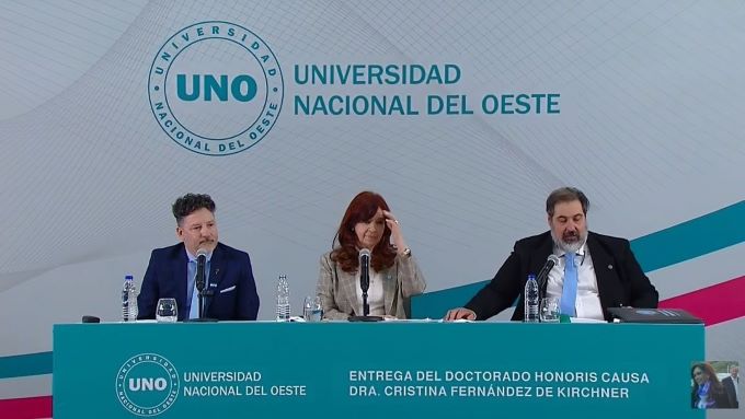 La ex Presidenta fue distinguida con un doctorado Honoris Causa, y se presentó en público en el marco de la asignatura «Pensamiento Nacional y Latinoamericano». Cristina Kirchner subió al escenario acompañada del rector de la universidad, Roberto Gallo, y el intendente de Merlo, Gustavo Menendez.