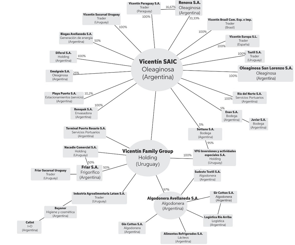 Un holding, es una sociedad financiera, cuyos miembros administran un conjunto de empresas, que se dedican a diversas actividades económicas e industriales. Observemos en la parte inferior del gráfico, que el holding es VICENTÍN FAMILY GROUP, cuya sede está en Uruguay, su domicilio legal. Mecanismo que tienen muchas transnacionales para evadir impuestos. Por ejemplo el grupo Techint-otra multinacional- tiene domicilio legal en Luxemburgo. Por supuesto que al momento de obtener subsidios los tramita al Estado argentino, no al suizo. Como se ve cumple con la condición de empresas que diversifican actividades, como la ALGODONERA AVELLANEDA, en Santa Fé, y la INDUSTRIA AGROALIMENTARIA LATAM S.A en Uruguay. Advertimos entonces que los manejos económicos-financieros alcanzan una complejidad, que puede ser difícil de desmenuzar para el que escribe o lee esta nota.