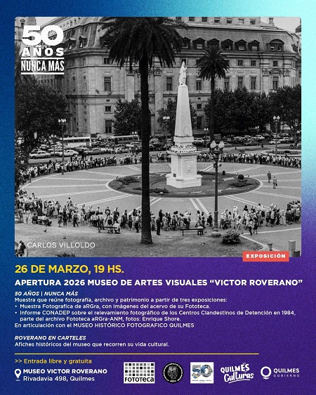 El Municipio de Quilmes informa que este jueves 26 de marzo desde las 19 se inaugurarán las exposiciones “50 Años, Nunca Más” y “Roverano en Carteles” en el Museo de Artes Visuales Víctor Roverano, ubicado en Rivadavia 498, en el centro de la ciudad.