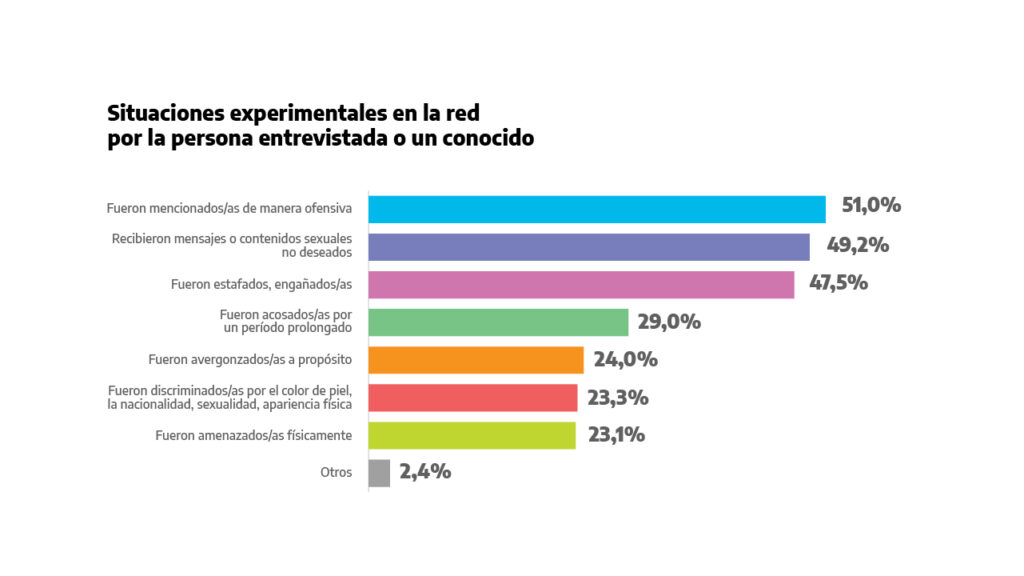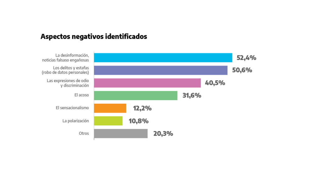 El relevamiento del CINEA arrojó que más del 50% de las personas encuestadas sufrieron agresiones virtuales al menos una vez y, en lo que respecta al acoso, las principales víctimas fueron las mujeres. La desinformación, las estafas, las expresiones de odio y el acoso fueron los aspectos negativos más mencionados por las personas encuestadas.