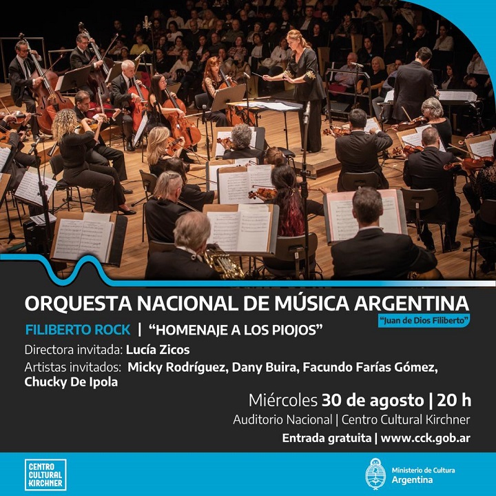 El miércoles 30 a las 20 h, en el Auditorio Nacional del Centro Cultural Kirchner, la Orquesta Nacional de Música Argentina “Juan de Dios Filiberto”, dirigida por Lucía Zicos, ofrecerá un concierto gratuito especial, en el espacio Filiberto Rock, a manera de Homenaje a la banda Los Piojos.