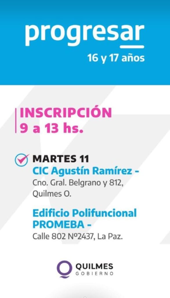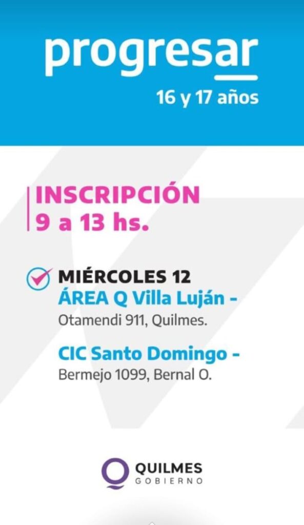 El Municipio de Quilmes continúa con las jornadas de inscripción a las becas Progresar para jóvenes de 16 y 17 años, que se realizan todas las semanas en distintos barrios del distrito, en el horario de 9 a 13, hasta el 31 de enero.