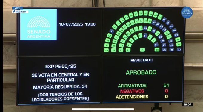 Finalmente El Senado convirtió en ley, a su vez, la declaración de la emergencia en discapacidad en todo el territorio nacional. Con 56 votos a favor y ni uno en contra, el Congreso convirtió en ley una iniciativa que apunta a asegurar el financiamiento de las pensiones no contributivas por discapacidad, así como la actualización de las asignaciones mensuales. Para cerrar los senadores rechazaron 51 votos a 0 el veto del presidente a la emergencia en Bahía Blanca.
