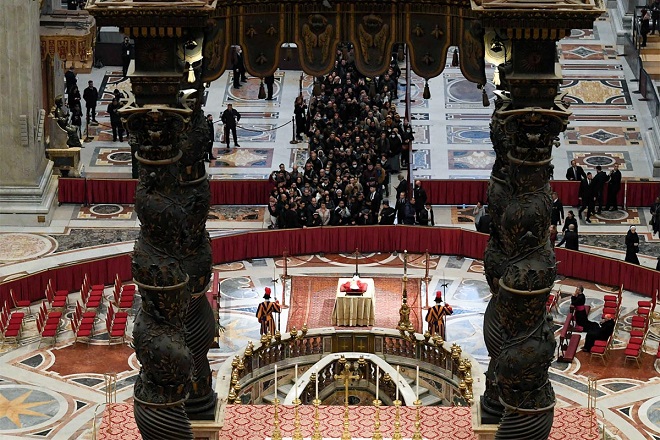 En la ceremonia, el purpurado dio gracias a Dios por los 12 años de ministerio del difunto Papa. En tanto más de 20.000 personas se habían congregado en la plaza para presentar sus respetos al extinto Pontífice, y prorrumpieron en un aplauso moderado pero sostenido mientras el féretro subía la escalinata y entraba en la Basílica de San Pedro.