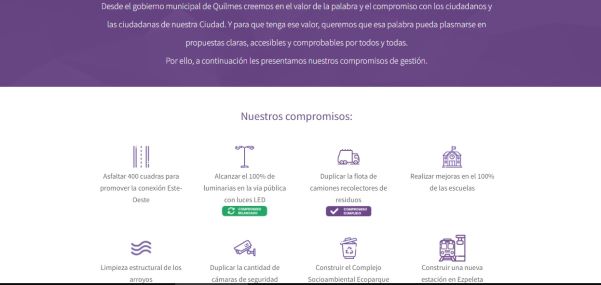 En primer lugar se destacan los Compromisos de Gestión, que son los objetivos estratégicos del plan de gobierno para la transformación de Quilmes. Se trata de proyectos que involucran desde obras de infraestructura y políticas de seguridad, hasta iniciativas de modernización y transparencia del Estado, pasando por políticas sociales, de géneros, entre otros. Cada compromiso cuenta con un diseño de metas claras, medibles y comprobables, y su estado de avance es público con el propósito de que la ciudadanía pueda auditar el seguimiento y cumplimiento de los mismos.