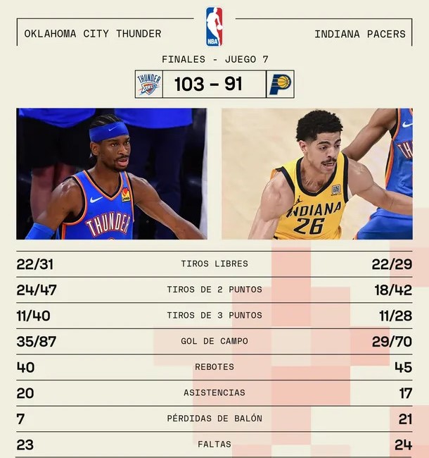 - Partido 5: Thunder 120 vs. Pacers 109 | Lunes 16 de junio, 21.30, Paycom Center de Oklahoma City