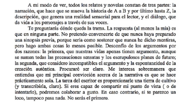 Cuando lo leí en mi adolescencia, pensé que tenía cierta razón, que esa es la única manera de escribir pero que, por supuesto, la creación artística, en tanto literaria, no puede reducirse a esa mínima expresión. Entendí que una idea semejante merecería una explicación mucho más profunda y extensa. Claro, yo pensaba eso porque aún faltaban siete años para el accidente que iba a poner en riesgo su vida y ocho para que escriba su verdadera obra maestra llamada «Mientras escribo».