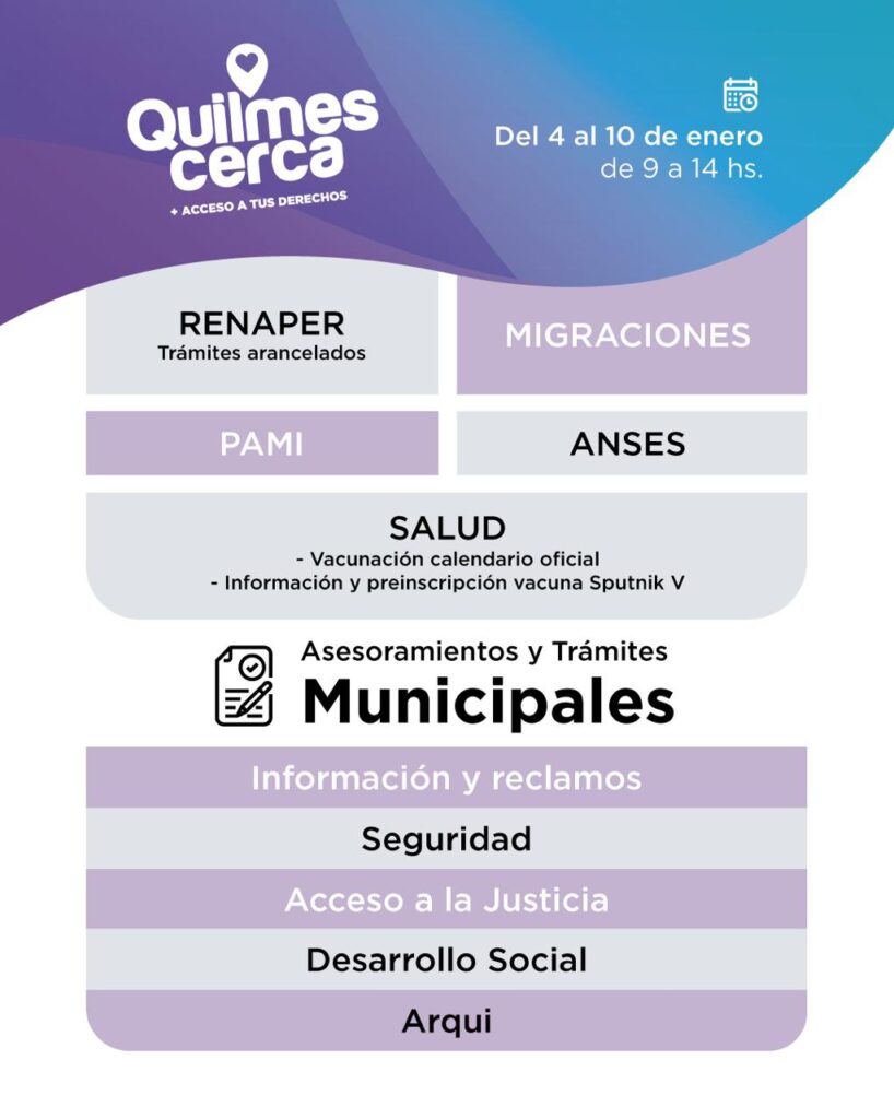 El Municipio de Quilmes realizará las jornadas itinerantes «Quilmes Cerca» con el objetivo de que los vecinos y vecinas de los diversos barrios puedan gestionar trámites y solicitar información de organismos nacionales (RENAPER, Migraciones, PAMI Y ANSES) y de la Comuna, en un solo lugar cerca de sus casas.
